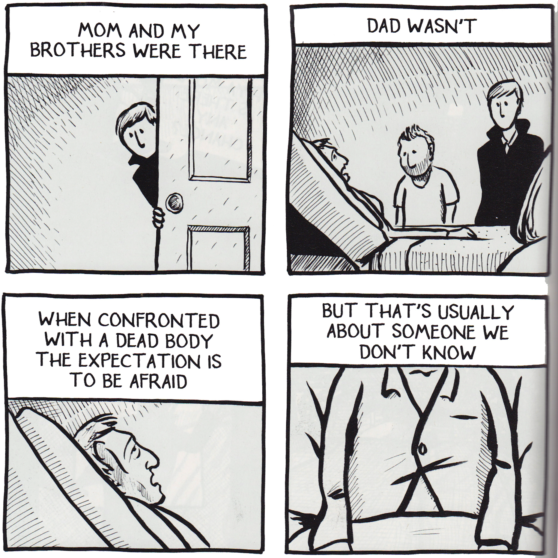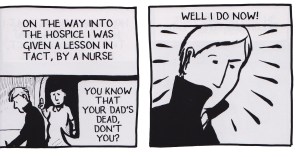 Three notable graphic memoirs published in 2011 visually portray dying and death. To this hospice nurse, these three representations of family hospice experiences struck me as refreshingly honest. They portray the kinds of experiences I’ve witnessed professionally but not previously seen presented in graphic narrative, and they stayed with me. Each is intimate, honest, and, I’m guessing, was challenging to produce, as in each book, the creator is presenting the death of their parent.