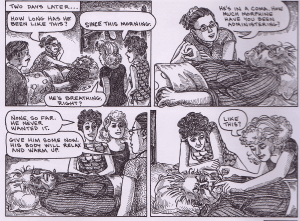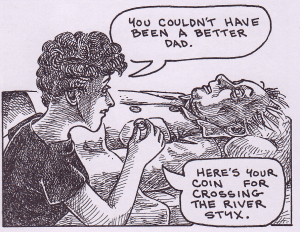 The theme of this year’s Graphic Medicine Comics Forum is “Visualizing the Stigma of Illness.” Stigma in illness often arises simply from close association with death. Dying is frequently an integral plot element in medically themed graphic novels and memoir, but it frequently happens “off-panel” thereby avoiding challenging visual representations of death and dying. There are notable exceptions to this, of course, such as Lisa’s Story: The Other Shoe by Tom Batiuk (Kent State University Press, 2007).
