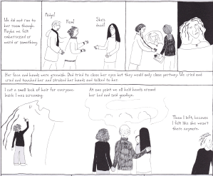 It is my hope that these three texts released in 2011 represent a shift toward visually representing family experiences of dying and death. The results are twofold – for the person experiencing the very personal loss, creating the graphic narrative can serve to integrate the experience of a loved one’s death into their ongoing life story. The narrative can also serve as a remembrance to and for those who experienced the loss. Addressing both of these points, Mackintosh told Deborah Vankin in an interview for the Los Angeles Times: