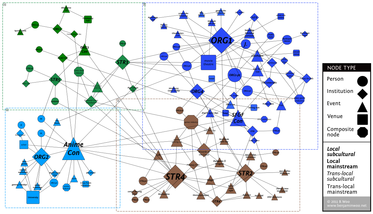 - In the bottom left is a cluster related to anime and manga fandom, which has a number of ties with nodes related to gaming and media fandom, but which also contains a parallel set of institutions that are relatively independent of the rest of the scene. The major nodes in this cluster are a university anime and gaming club (ORG2) and an annual anime convention held locally.