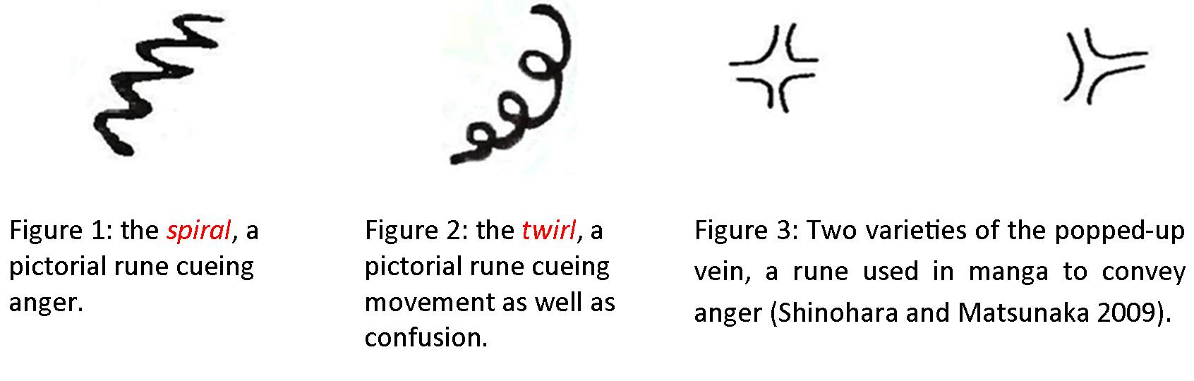 A third type of comics mark that helps cue emotion are the flourishes that are sometimes called “pictorial runes” (Kennedy 1982, Forceville 2005, 2011). They mostly, though not exclusively, convey information relating to characters’ emotions. Pictorial runes comprise a small set of items, whose meanings seem to be fairly fixed – but in order to gain more insight in this issue, empirical testing is imperative (Ojha and Forceville in prep. provide a starting point). There is one rune that is associated specifically with anger: the “spiral” (figure 1; to be distinguished from the “twirl,” figure 2), which may occur both on its own, or as a “multiple” of two or more, arranged as a halo around a character’s head. Shinohara and Matsunaka (2009) found a pictorial rune that originates in manga: the “popped-up vein” (figure 3). This rune seems to have evolved from a hyperbolic version of an embodied feature conveying anger (much like the lobster-red face) into a signal that has increasingly lost its link to the body, since it appears also in places where a popped-up vein could never appear realistically: in a character’s cheeks or hair, or in text balloons.