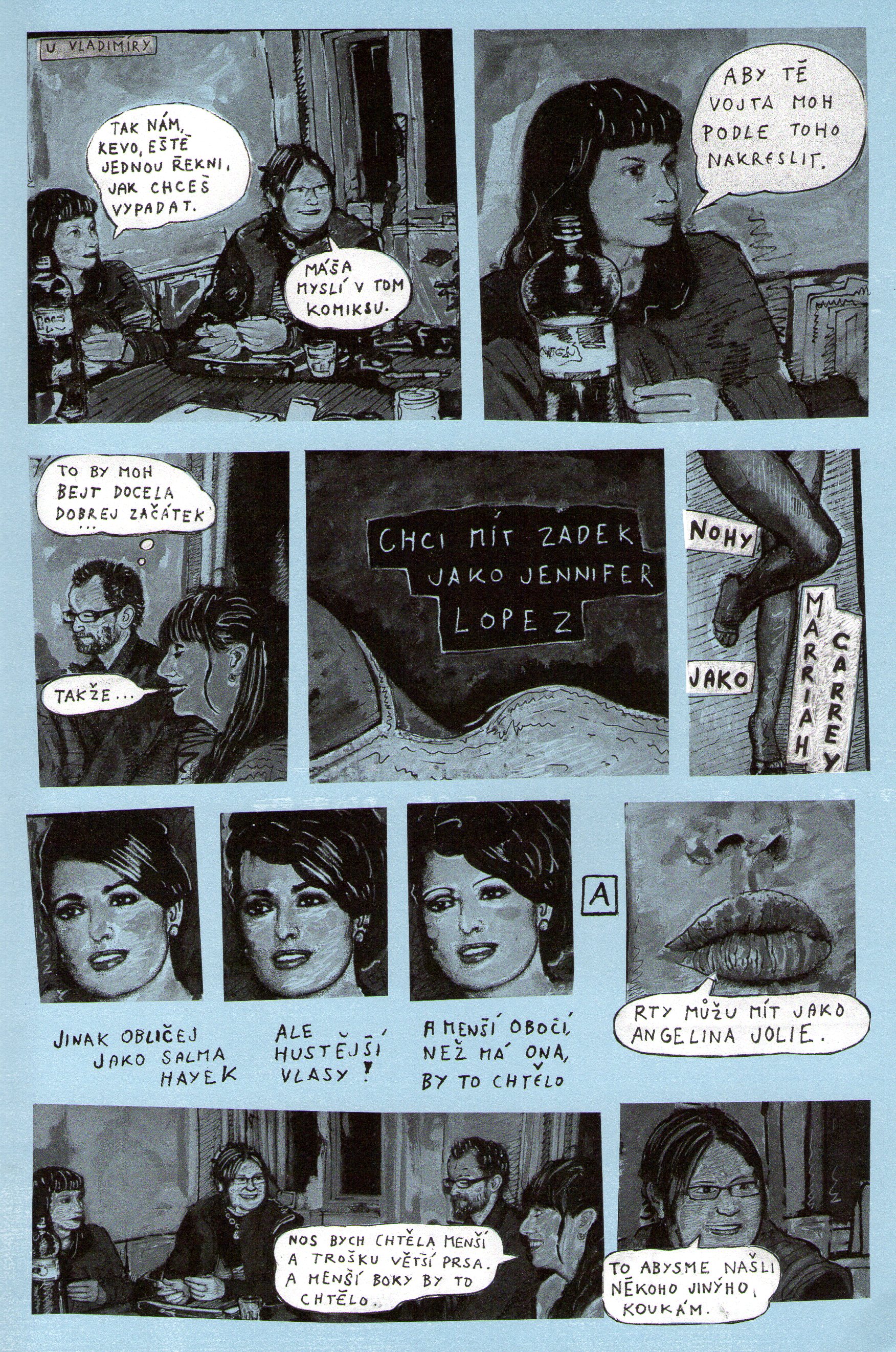 Keva begins precisely on such a note of postmodern literary collusion: over drinks the authors ask their young collaborator/muse how she wants to be drawn (as Mašek thinks to himself, with a self-satisfied grin, “This would make for a really nice opening …”). She replies with the body parts of celebrities: Jennifer López’s posterior, Mariah Carey’s legs, Angelina Jolie’s lips, “Or else the face of Salma Hayek, but with thicker hair! And thinner eyebrows than her, that’s what I’d like.” (The somewhat morbid “plastic surgery” on the actress’ face unfolds over three panels.) Upon turning the page, however, we see not an idealized, Frankensteinian portrait, but a photorealistic splash of Keva in the here and now.