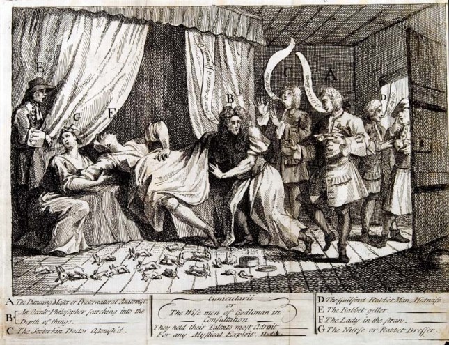 Having given birth on 27 September 1726 to what appeared to be the body of a cat, Mary Toft called upon John Howard, a leading Guildford obstetrician, who attended and presided over the subsequent ‘births’ of a variety of animal parts as well as nine dead rabbits.[2] Howard’s reaction was to seek publicity, sending letters to the country’s leading surgeons as well as to the secretary of King George I. The case was investigated, on George I’s request, by Nathaniel St. André, surgeon to the King, and by Samuel Molyneux, the Prince of Wales’s secretary. Mary Toft’s renown increased, aided by St. André’s statement that he believed the phenomenon to be genuine, an account of which was published in pamphlet form as A Short Narrative of an Extraordinary Delivery of Rabbets as early as December 1726, with a second edition in 1727.[3]