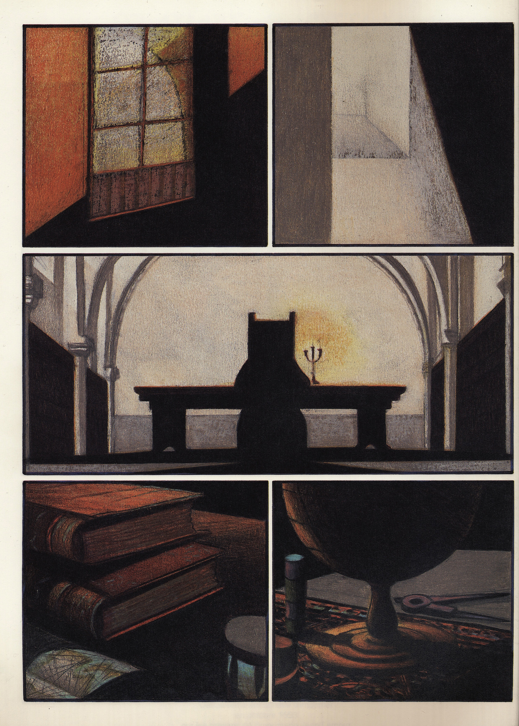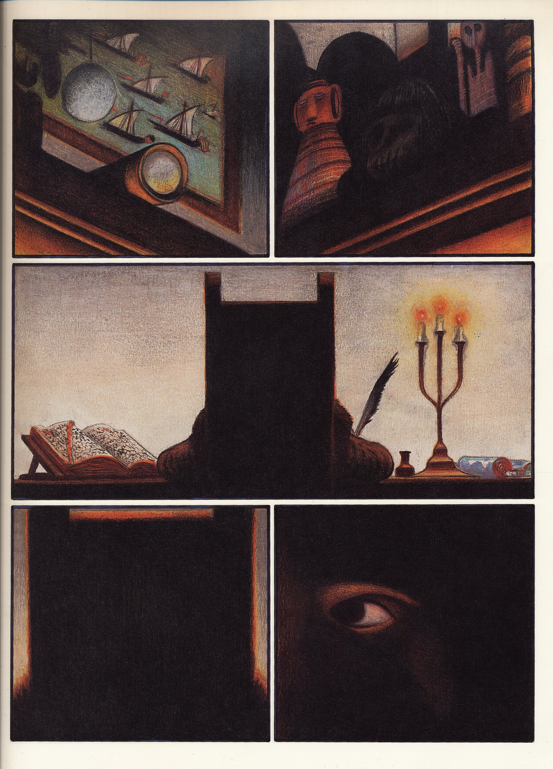 These gaps are also obvious on the microstructure. In the very first panel, the book offers a view on a haven, large ships dominating the image, before moving through a window into a high study room (Fig.1). In the middle of this room, taking up most of the space, is a desk with a lit chandelier. From behind, the reader can make out the silhouette of a figure in a high backed chair. The next panels show artifacts lying in the room: thick leather-bound books and maps, a globe, binoculars, a framed painting with ships, indigenous statues (Fig.2). Another shot back to the figure in the chair links these objects to this person. Mattotti thus uses these artifacts to refer to what we know about Cabot as a person: He was a cartographer, a navigator and he must have sailed to far-off shores. By doing so, the artifacts become visual representations of the sparse information historians extricated from documents. The panels, however, do not stand for a progression in time. They are interchangeable, arbitrary and demonstrate the fractured nature of our knowledge on Cabot. Similar problems arise with depicting Cabot: We have one portrait of Cabot at a very advanced age, created by Hans Holbein around 1550 but no conception what he really looked like at the time of his voyages. To underline just how strongly our perception of Cabot is based on assumptions, Mattotti produces several variations of Cabot’s face, juxtaposing them next to each other to demonstrate that any of these versions – an infinite number of versions – is possible. It is at the hands of the narrator to choose one version. It is a task every illustrator has to face, normally, however, it is not explicitly addressed within the story. Incorporating it into the narrative highlights once again the central role of the gap.