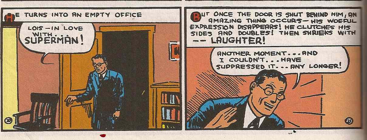 Something of the same dynamic appears in Superman’s “private,” or romantic, dealings with Lois Lane. There, reflecting his insignia, Superman is involved in a “love triangle.” At two vertices of this triangle are the two identities of Superman, the superhero himself and his timid/weakling alter ego, Clark Kent. The third is occupied by Lois, the intrepid reporter for the newspaper at which Kent also works. Kent is in love with Lois (or claims to be) and perpetually wishes, at the very least, to take her on a date, while Lois, of course, falls for Superman, the ‘he-man’ that appears to be everything Clark is not. Just as Lois rebuffs all of Clark’s advances, however, Superman rejects hers, taking a kind of perverse pleasure in revenge for her mistreatment of his “other self” and laughing at her behind her back.