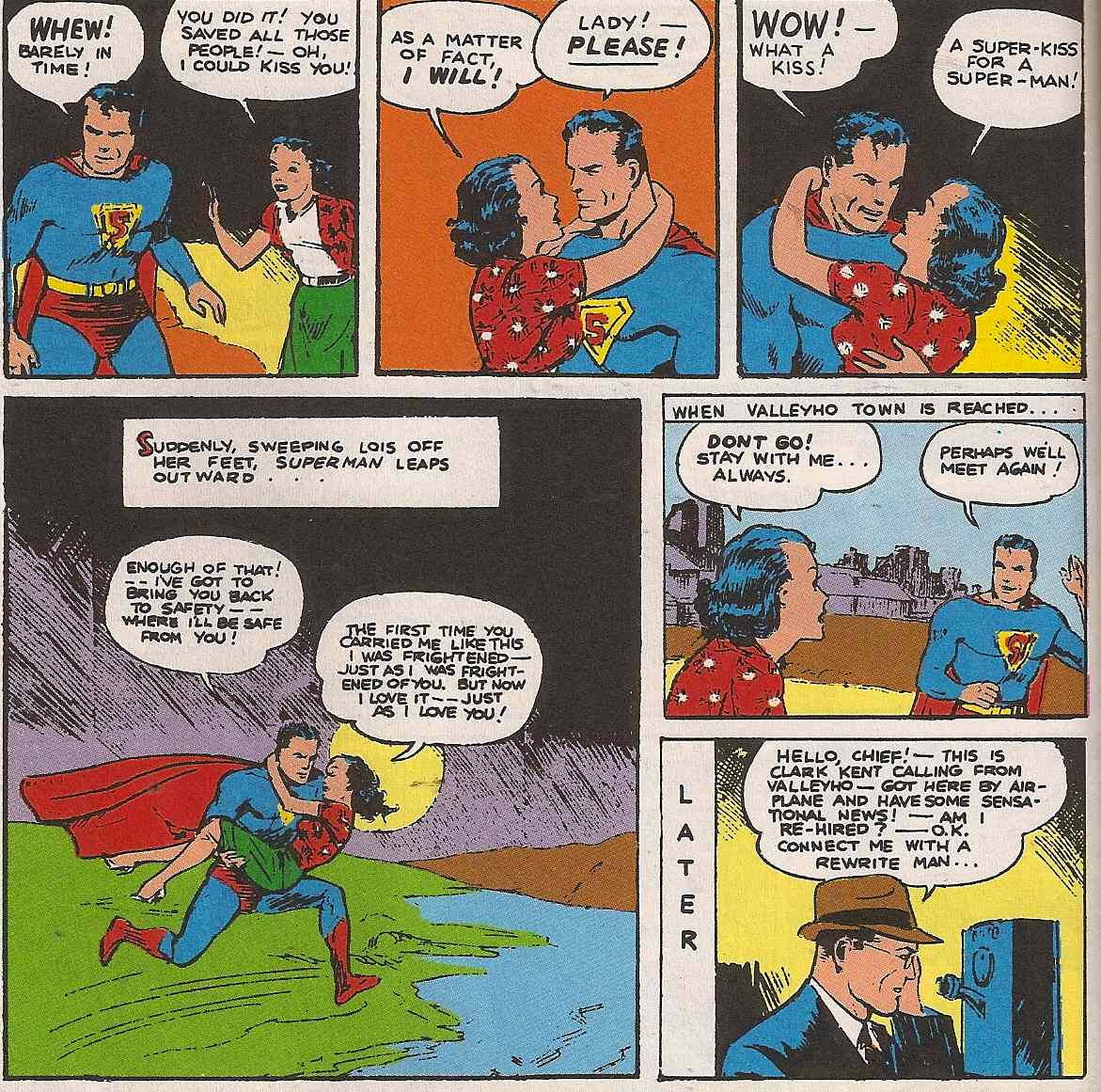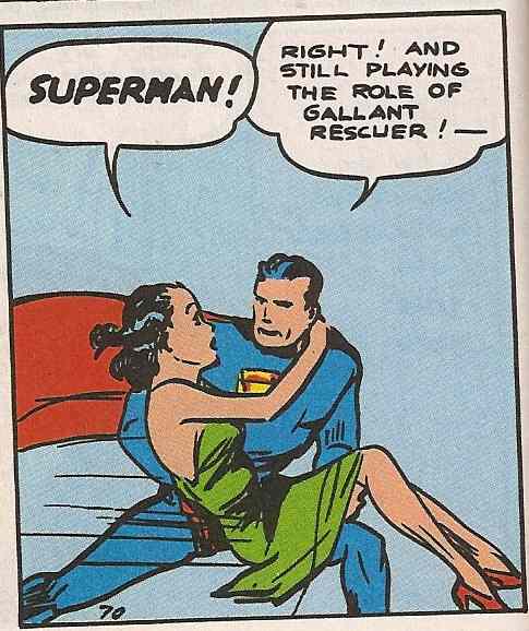 Sedgwick’s rereading of Rubin (itself something of a rereading of Claude Levi-Strauss’ account of kinship structures) then focuses on the ways in which the ‘traffic in women’ is not only a model by which women are “objectified” as commodities to be traded, but by which same-sex male desire is expressed, ‘triangulated’ through women. That is, the woman in the “middle” of a love triangle serves as the transient repository for the “desires” the men actually feel for each other (social, economic, and/or sexual) (Between 21). This desire is “homosocial” (not strictly “homosexual”) because it does not necessarily involve any explicitly expressed sexual desire. At the same time, Sedgwick argues that the supposed distinction between homosexual and homosocial desire is not as solid as societies pretend. Rather, it is part of a fluid ‘continuum’ wherein social/economic bonds slide into, or blur into, sexual ones (Between 3-5). For her (and for Rubin), the institution of marriage, and the role of reproduction in sealing social and economic bonds leads not only to the objectification of women, but also to homophobia, since the line between the homosocial and the homosexual must be, and is, heavily policed. If the ‘traffic in women’ is so important to the sealing of bonds “between men,” then it is dangerous for such triangulation of desire to be circumvented in favor of a direct homosexual connection. Homophobia is then a logical result of a patriarchal/homosocial society wherein power is sealed through the trade in women as commodities. Rubin argues that, ‘The suppression of the homosexual component of human sexuality, and by corollary the repression of homosexuals, is…a product of the same system whose rules and relations oppress women’ (Rubin 180). For Sedgwick, then, homoeroticism is a repressed but constant presence in patriarchal societies because it both facilitates homosocial bonds and threatens them. The lingering homophobia in our own culture (and certainly that present in the 1930’s-1940’s America of these Superman comics), then, can also be seen as a signifier of the still powerful structures of patriarchy and misogyny.