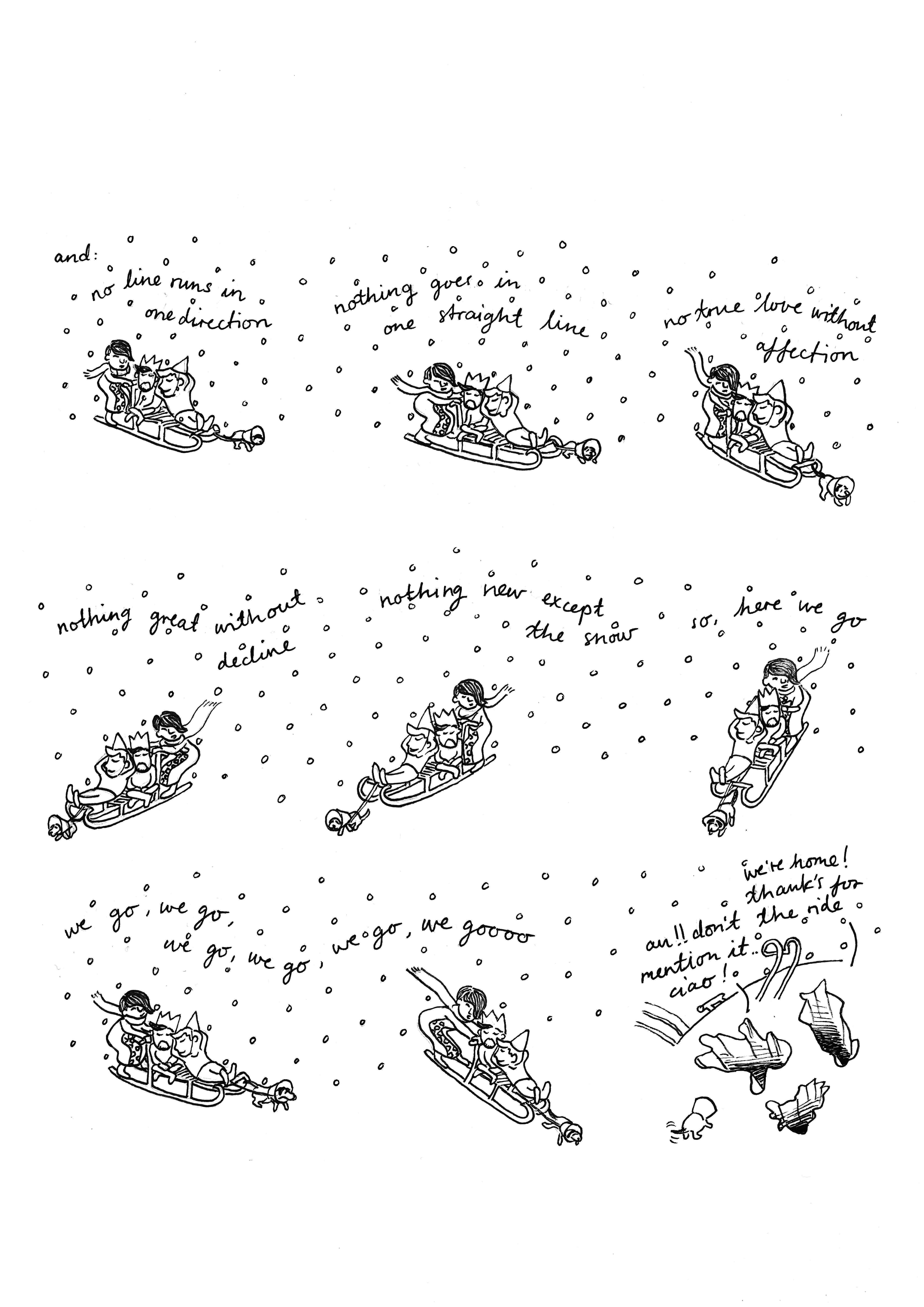 However, the song thankfully maintains a good distance from its own potential axiomatic heaviness, not only because, like most of the book, it whimsically moves from one topic to another, but also because the three goofy characters are all catapulted off the sledge, presumably because of an error committed by the little dog driver with a medical collar around its head.