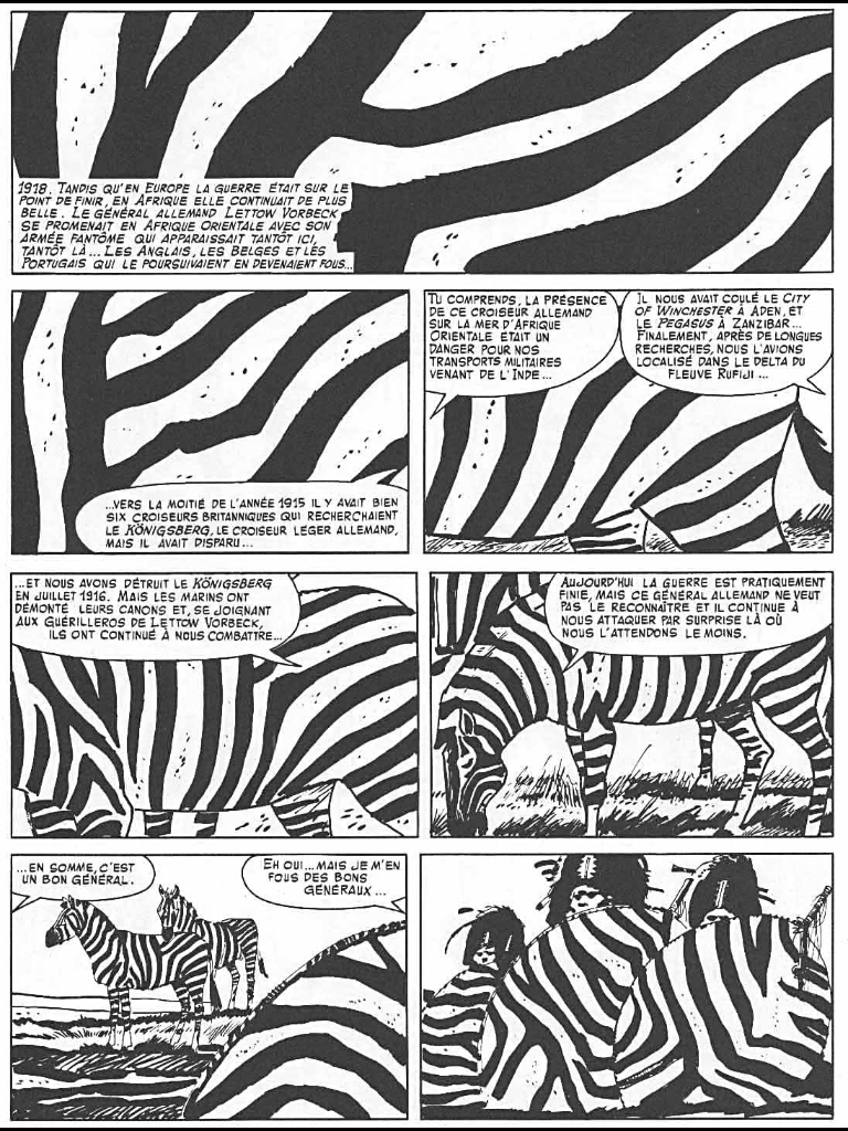 This reduction he was aiming at often took the form of a very particular shift in perspective that Pratt used as opening sequence in his stories: he zoomed in on his subject to such an extent that it was no longer possible to recognize it. Instead, it appeared abstract as the picture’s motif was concealed by the extreme close-up. In a second step, however, Pratt slowly zoomed out again, panel by panel enlarging the section shown, until finally in the last picture the motif was fully revealed. The first time he experiments with this is in the story ‘Leopardi’ (1973) which starts with a white panel shot through with thick black lines (fig. 1). The caption refers to the war in Africa in 1918 which does not seem to have any connection to the drawing. In the third panel, one can identify hind-legs and a tail and the fifth panel reveals the black lines to be the stripes of a grazing zebra. As the first page has seven panels, it is not much a surprise that the black lines turn out to be a zebra skin – after all the reader perceives the page as a whole before reading each single panel. The same applies to the opening of the 1985 story ‘Tango’ that in its original black and white version starts with several round and oval shapes colliding in the opening panels. The last panel of the same page shows these shapes to be billiard balls in extreme close-up.