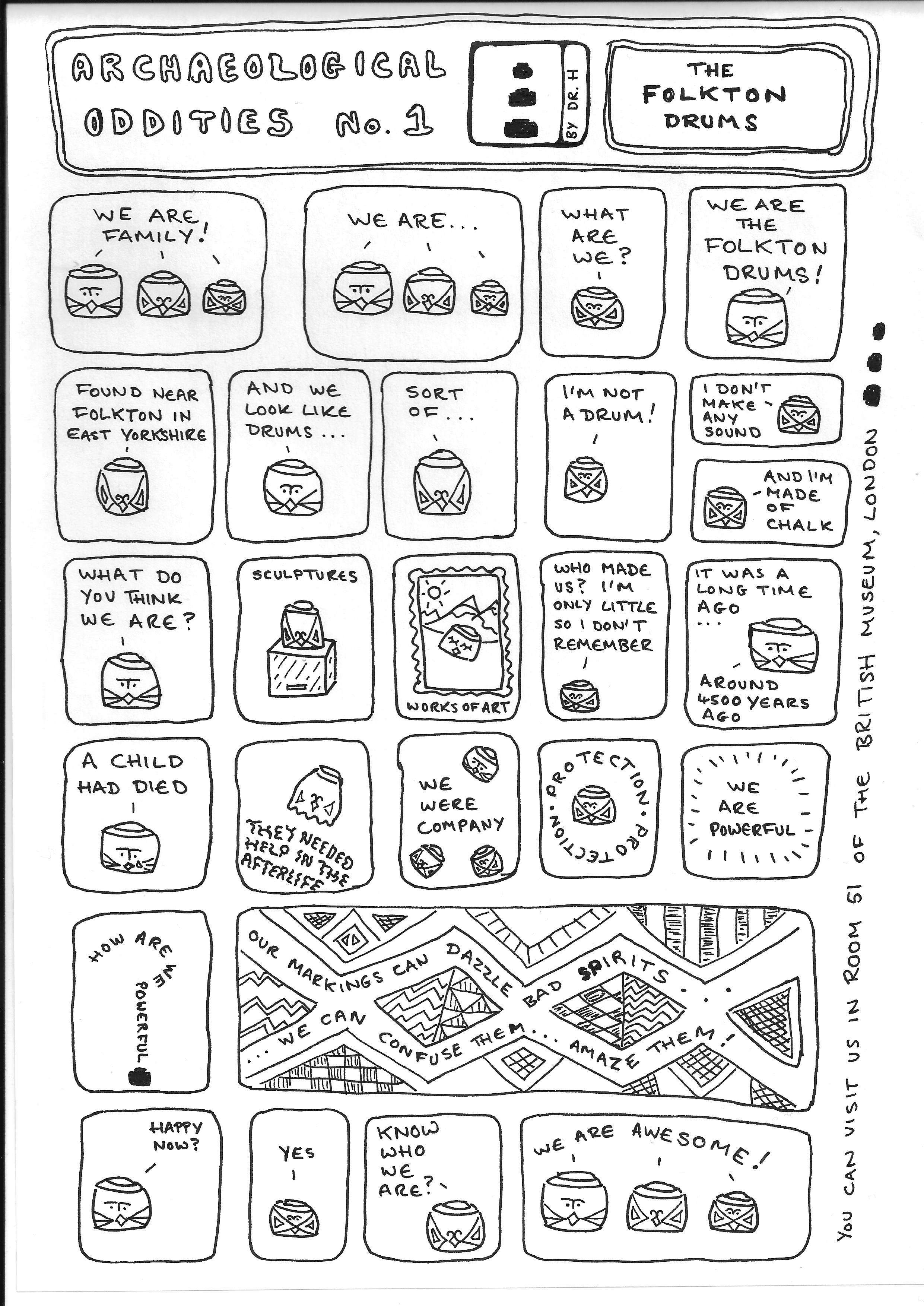 HS: Archaeological Oddities had its origin in a jokey present I made for my partner Andy Jones, while he was researching the Folkton Drums [2] for his last book, Prehistoric Materialities. It was a Tunnocks Teacake box turned into a “Make your own Folkton Drums” set. It had picture of the three Neolithic chalk carvings on the outside, with them saying “We are Family”. This picture stuck in my head, until one day I found myself jotting down a conversation between the three drums. I messed about, working on simplifying the drums and finding a simple drawing style, and made the first Archaeological Oddities. The people I showed it to were really positive, so I kept going. I chose oddities, because I think archaeologists sometime gloss over things that don’t fit into a neat category. An archaeologist once told me that you couldn’t discuss Silbury Hill [3] because you couldn’t categorise it! This stayed with me.