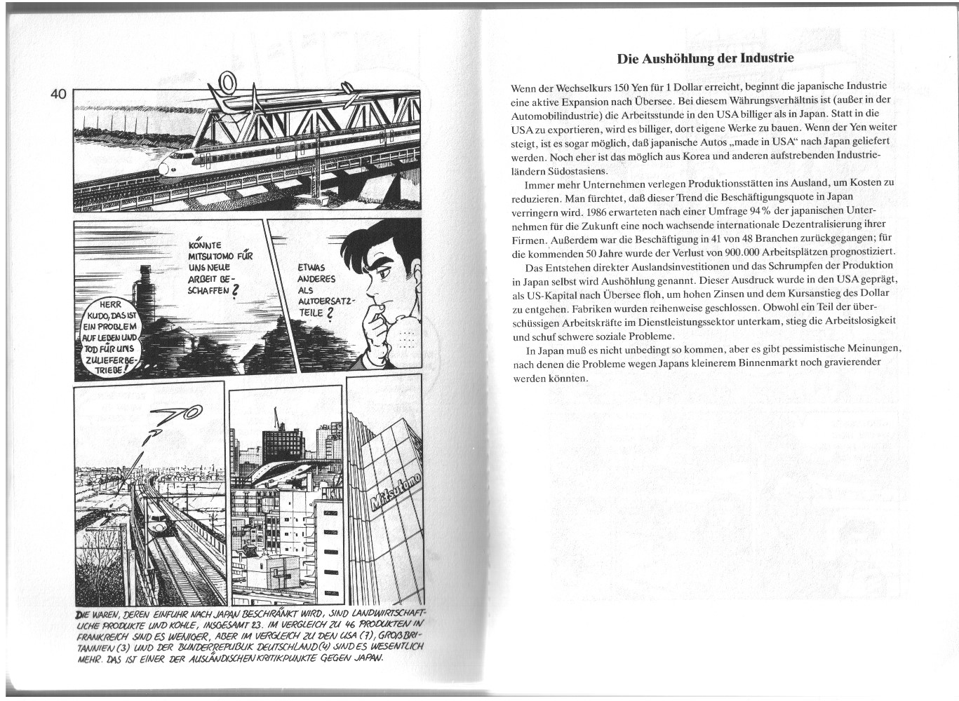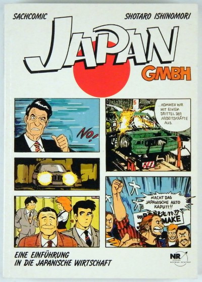 Let us now move on to an example of the second kind of manga, those translated for the general public. Japan Inc. by Shōtarō Ishinomori was originally published as マンガ日本経済入門 (Manga Nihon Keizai Nyūmon) in three volumes from 1986–1988. It is a fictional story about two young managers in a Japanese company which is struggling with various economic problems. This comic is interspersed with occasional text sections explaining economic facts and theories. It was translated into English by the University of California Press in 1988 and into French by the publishing house Albin Michel in 1989, only the latter of which could be regarded as a comics publisher.