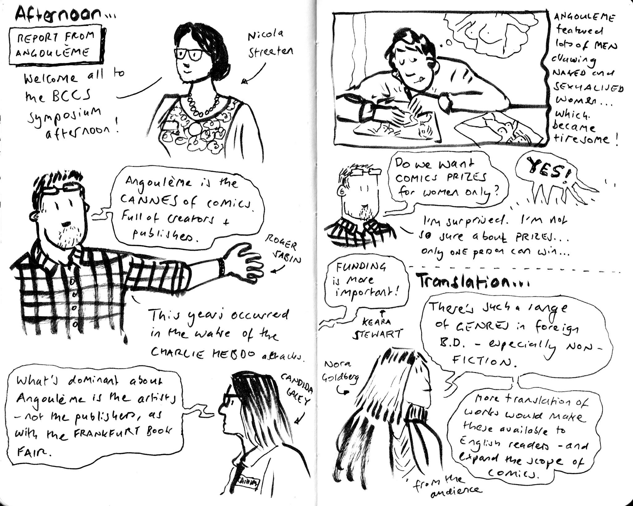 Nicola Streeten was a key driver in moving forward this first BCCS symposium, which sought to celebrate those two strands of our interests — scholarship and creation of comics — by structuring a day, Saturday 30 May 2015, which would progress from research-led in the morning, through to creator-led in the later afternoon, and which would bring together comics scholars and creators, as well as being open to interested members of the public. All attendees were encouraged to draw (and write, and photograph) their notes and reactions to the day, and pages were left blank in the programmes for this very purpose.
