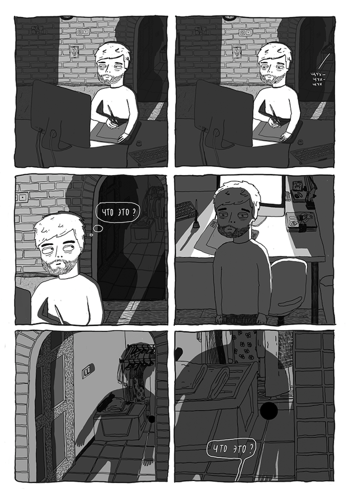 Ivan Eshukov is one of the few Russian comics authors to have received high appreciation from fellow artist David Lloyd. Lloyd appeared on the “Videosalon” web show on the Maxim Russia YouTube Channel. In this web show star guests evaluate their Russian colleagues’ creative works. The artist Nicolay Pisarev posted on his home page: “It’s so pleasant when your book is praised by readers. But it’s even more pleasant when the reader is David Lloyd!” Lloyd liked Nicolay’s graphics drawn for the surrealistic comics Predmety (The Objects). Nicolay has explained that that the storyline of Predmety was inspired by Carl Gustav Jung’s work.