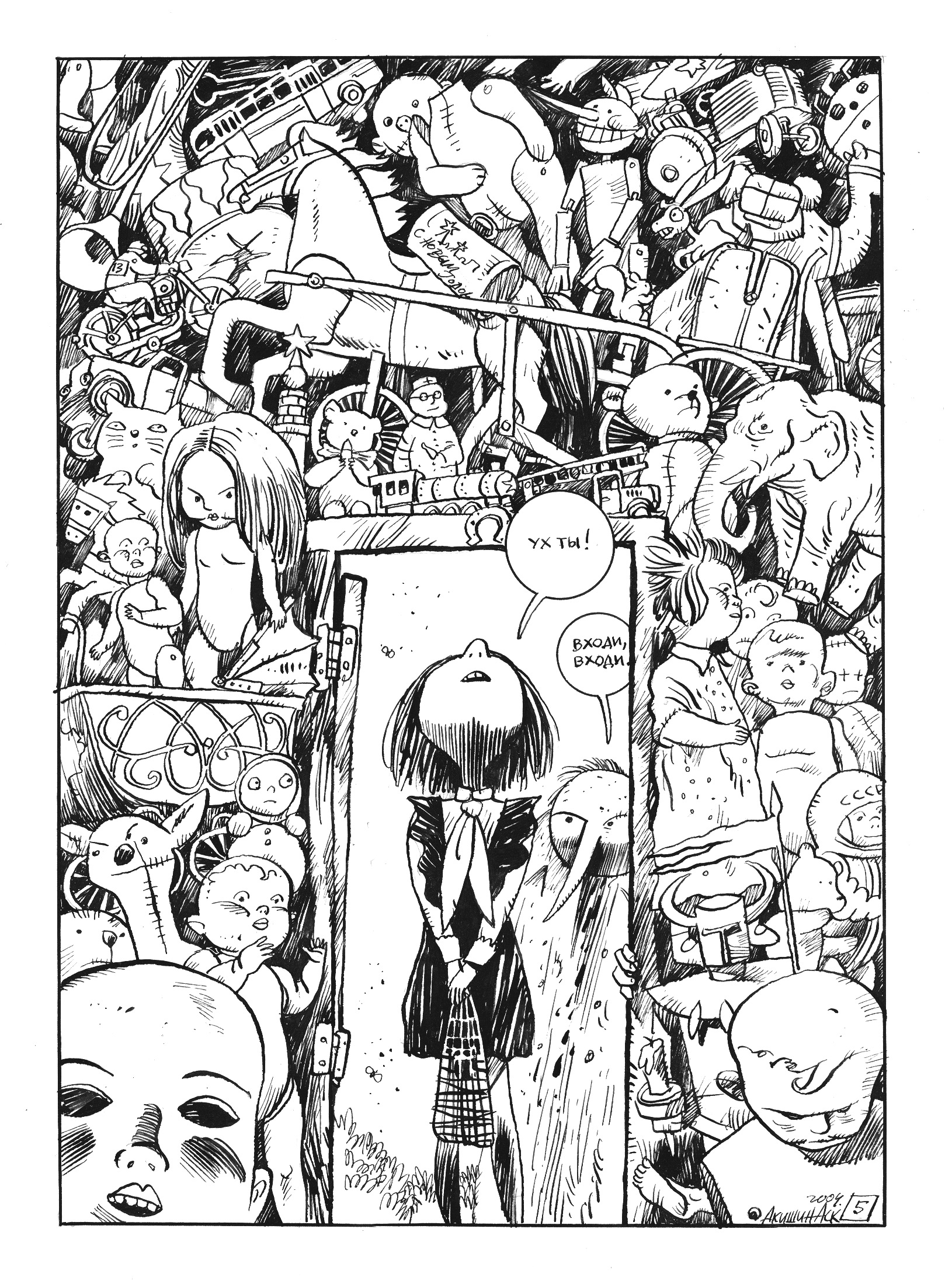 What are Russian comics about? For instance,Veter umer (The Wind is Dead) by Danya Udobnyi, Chuvak (The Dude) by Zakhar Yaschin, and Bez tela (Without body) by Julia Nikitina (Ner-tamin) are about existential conflict, looking for one’s place in this life. Pionerskaya Pravda: Horror by Askold Akishin, Borovitsky by Ivan Eshukov, Doctor Lutsid by Alexey Volkov, and Aurora: drugaya istoruya (Aurora: another story) by Maria Konopatova and Timofey Mokienko are fantasy stories unfolding against the background of real Russian history. Undertow by Artyom Trakhanov, Predmety by Nicolay Pisarev, Bez slov (Without words) by Evgeniy Yakovlev, and Architects by Ilya Obukhov are fantasy comics. Ksenia Kudo works in the shōjo manga genre: “I don’t really like horror. The stories I want to tell my readers are about friendship, respect and love.”