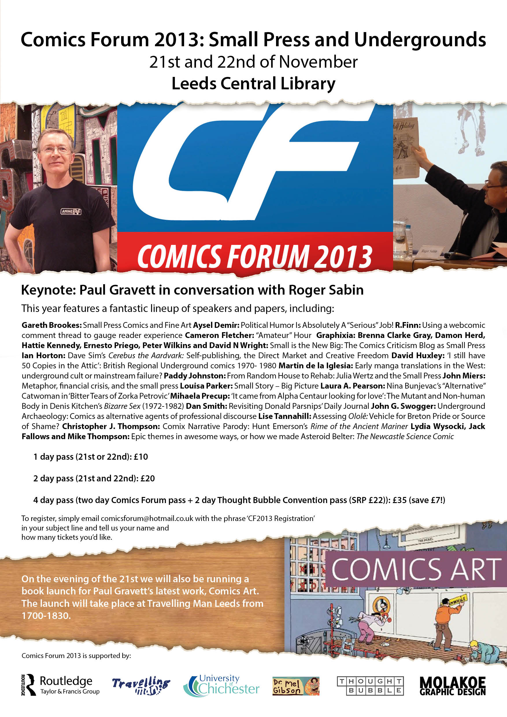 Comics Forum 2013 is supported by: Thought Bubble, the University of Chichester, Routledge, Travelling Man, Dr Mel Gibson and Molakoe.